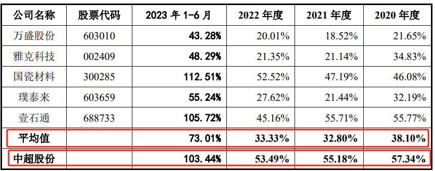 另外,2021年至2023年及2024年上半年,中超股份应收项目占营业收入的比例分别为 57.34%、55.18%、53.49%和103.44%,显著高于同行业可比公司平均水平,也被重点问询。